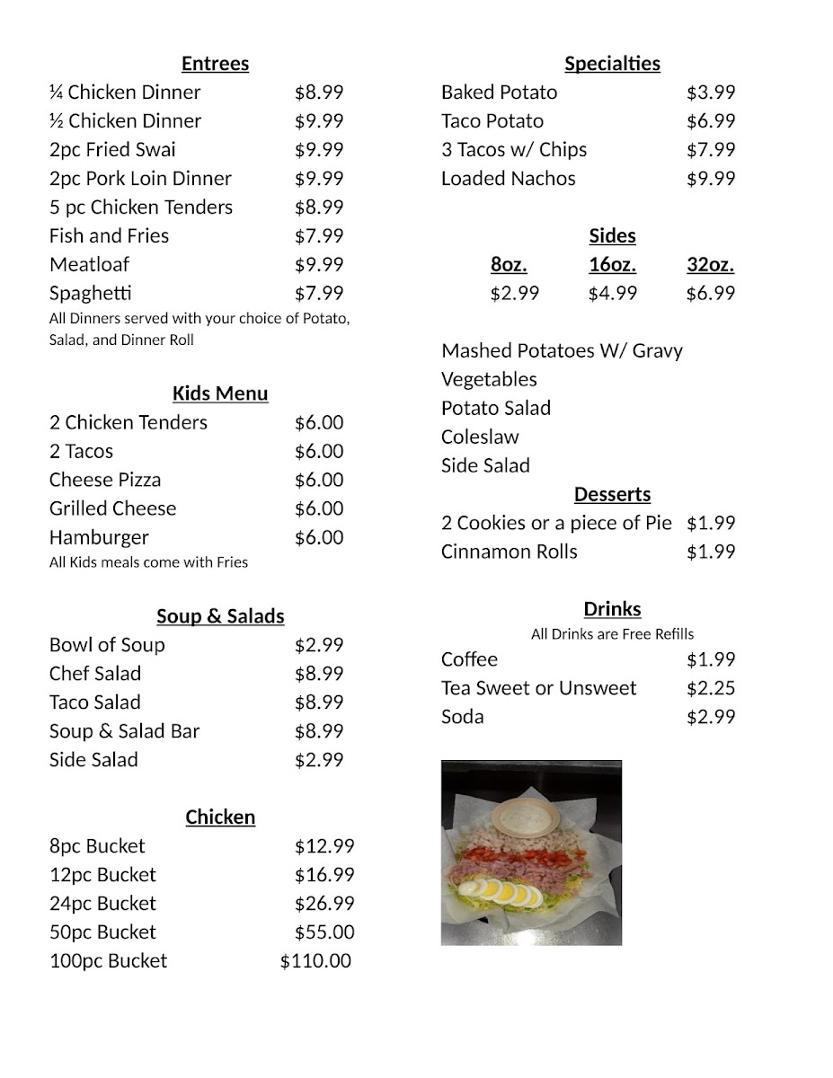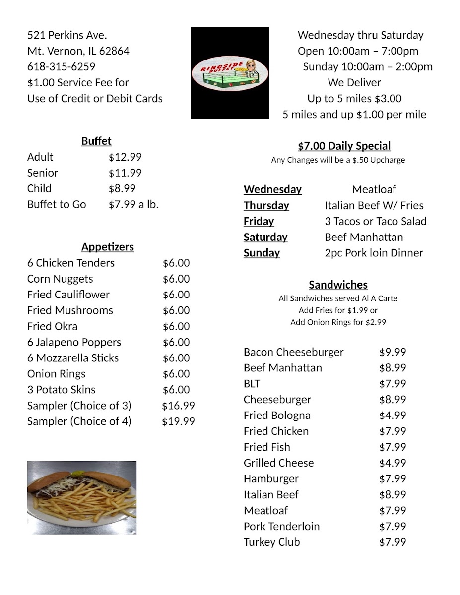 From a reviewer’s perspective, The Ringside Buffet at 521 Perkins Ave offers a menu that’s both diverse and comforting, catering to a variety of tastes. Appetizers like 6 Chicken Tenders, Corn Nuggets, Fried Cauliflower, Fried Mushrooms, and Fried Okra set the tone for a hearty meal. Sandwich options, including Bacon Cheeseburger, Beef Manhattan, BLT Cheeseburger, and Fried Bologna, promise classic American flavors. For entrees, diners can enjoy 1/4 Chicken Dinner, ½ Chicken Dinner, 2pc Fried Swai, 2pc Pork Loin Dinner, and 5 Pc Chicken Tenders, while specialty items like Baked Potato, Taco Potato, 3 Tacos W/ Chips, and Loaded Nachos add a playful twist. The menu’s sides-Mashed Potatoes W/ Gravy, Vegetables, Potato Salad, Coleslaw, and Side Salad-complement main dishes perfectly. Families are well-served with the Kids Menu, featuring 2 Chicken Tenders, 2 Tacos, Cheese Pizza, Grilled Cheese, and Hamburger, while desserts like 2 Cookies Or A Piece Of Pie and Cinnamon Rolls provide a sweet finish. Soup and salad lovers can choose from Bowl Of Soup, Chef Salad, Taco Salad, or the Soup & Salad Bar, paired with Side Salad. For larger gatherings, the chicken buckets ranging from 8pc to 100pc ensure everyone is satisfied. Additional options such as Buffet To Go, Italian Beef W/ Fries, 3 Tacos Or Taco Salad, and 2pc Pork Loin Dinner highlight the restaurant’s flexibility and variety. Overall, the menu balances traditional comfort food with approachable specialties, all presented in generous portions that make The Ringside Buffet a welcoming spot for casual dining or family meals.